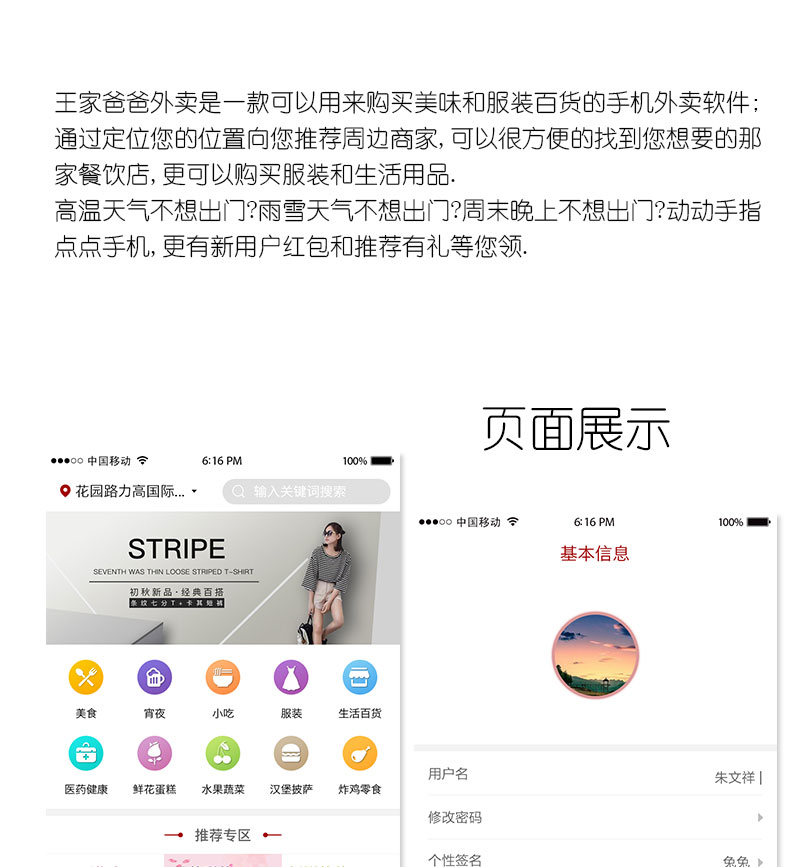 王家爸爸外卖是一款可以用来购买美味和服装百货的手机外卖软件;通过定位您的位置向您推荐周边商家,可以很方便的找到您想要的那家餐饮店,更可以购买服装和生活用品。